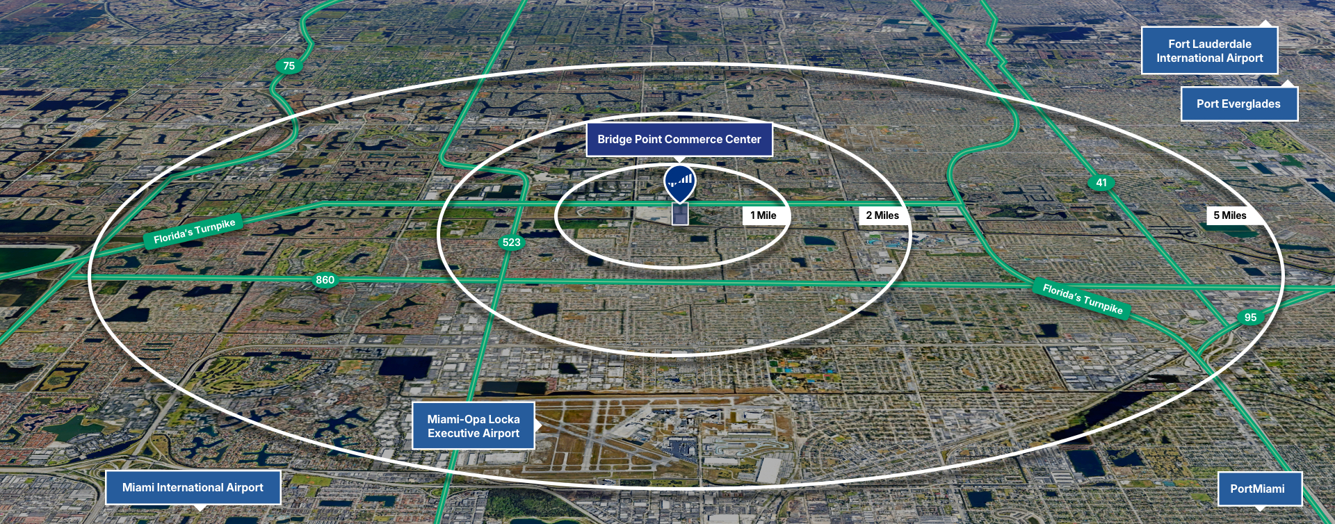 The park offers frontage on the Florida Turnpike with 155,310 cars passing per day. The Park lends itself to various industrial uses including traditional and bulk distribution, light manufacturing and ecommerce. The park’s location is equidistant from Miami International Airport and Fort Lauderdale International Airport and offers immediate access to all points in South Florida via the Florida Turnpike and I-75. The labor market is highly desirable with the ability to pull from Hialeah, Medley and Miramar.