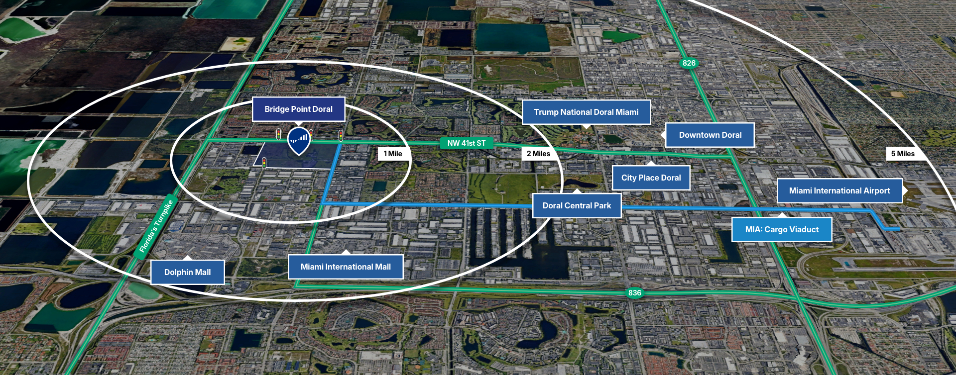 Located in the heart of the Miami Airport/Doral Central Business District, Bridge Point Doral (BPD) is the newest and most-coveted industrial development in South Florida. BPD offers numerous physical and locational amenities which add operational value, other area industrial projects cannot offer. Located in Doral, the most prestigious industrial submarket in Florida, BPD offers a true work, live-play environment within minutes of PortMiami and Downtown.